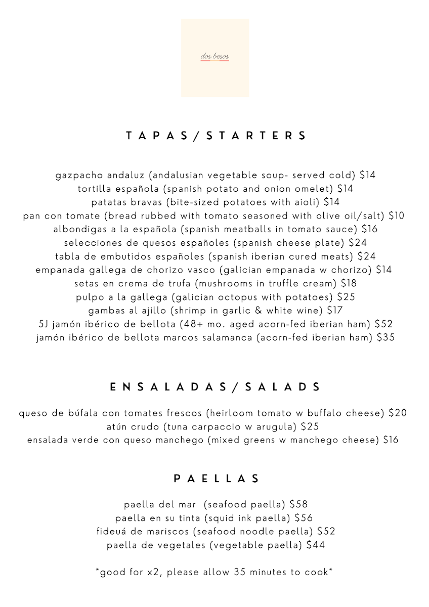 Welcome to dos besos, a charming restaurant located in the heart of Pasadena. This culinary gem captivates with its authentic Spanish cuisine, offering a menu that delights the senses. Start your meal with exquisite Tallarines Con Trufa Negra or savor the richness of Macarrones Con Jamón Serrano. Among the Platos Principales, don’t miss out on the Salmon Al Limon Con Alcaparras—its melt-in-your-mouth texture has customers raving.